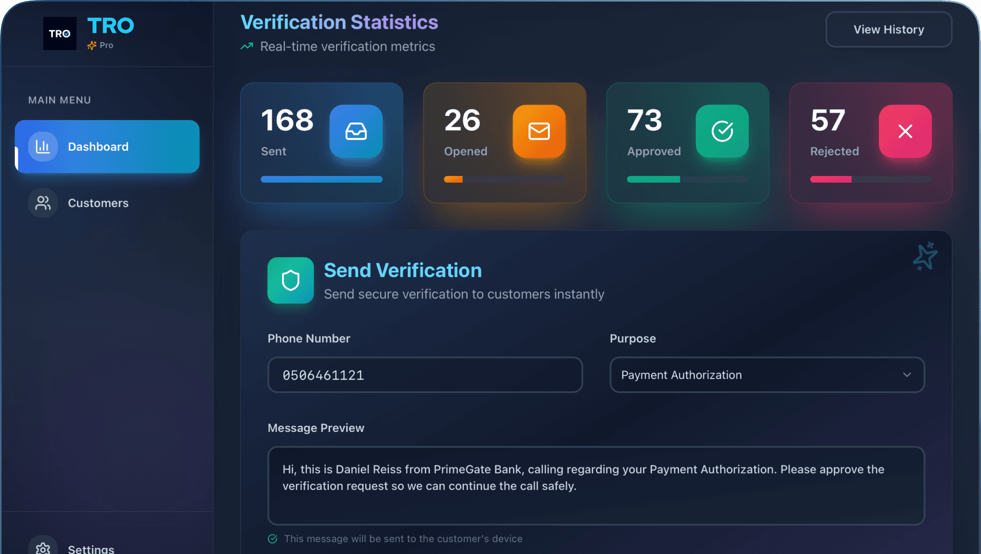 The recipient receives a verification via the TRO app or an automatic SMS with full context.