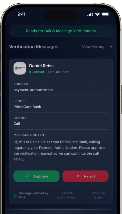 TRO allows organizations to verify phone calls and messages automatically, securely, and in real-time — even before contact is made.